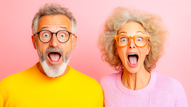 Surprised elderly couple with shocked expressions against yellow background