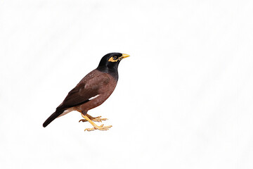 Acridotheres tristis - The common myna, isolated on a white background. The bird is often seen as a plague in countries as Thailand and Australia. The agile animal has a beautifully colored plumage.