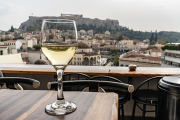 Glass of wine with a view of the Acropolis in Athens, Greece. White wine. Wide angle close up.