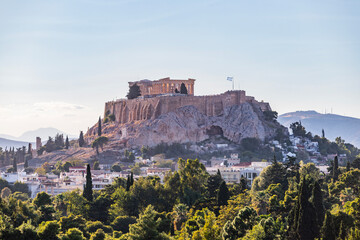 Sun hiding behind the columns of the Parthenon temple at Acropolis site on a sunny evening in Athens Greece
