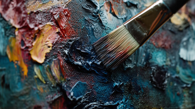 Detailed shot of a colorful paint palette with mixed paints and paintbrushes