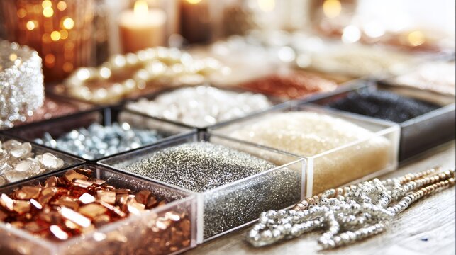 Rose-gold sandals flatlay with gold gifts, beads and party accessories, ample copy space