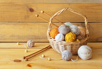 Beige and soft pink colors of woolen and acrylic threads. There are pearl beads on the balls. Still life. Sackcloth. Fabric background