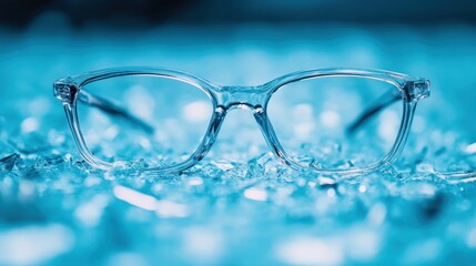 A pair of clear eyeglasses placed prominently on a bed of shattered glass, creating a visually striking contrast between the delicate glasses and the sharp glass shards.