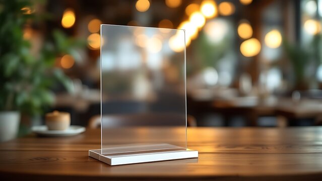 Acrylic sign holder displays a blank white card on a wooden surface with a blurred background