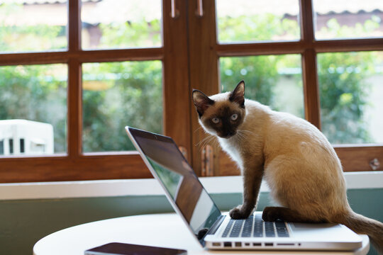 Animals cat acting like a human. Cat working at Laptop computer