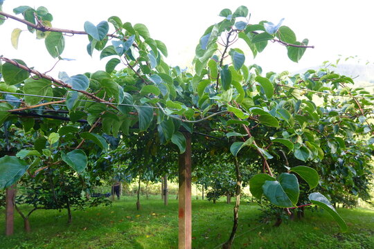 Hardy kiwi growing on vines in orchard, supported by wooden posts