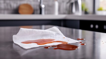 Efficiently cleaning up a liquid spill on a surface with a paper towel, capturing the moment of fast action and effective cleaning in a neat environment.