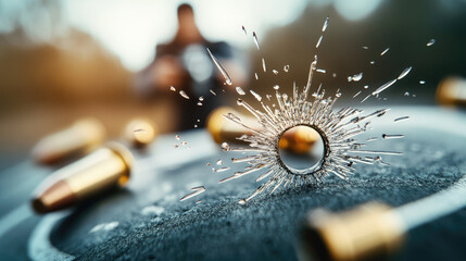 bullet striking surface creates dramatic splash of water droplets, with spent cartridges scattered around. scene captures moment of impact and tension