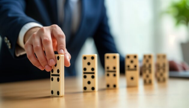 Businessman strategically prevents domino effect. Hand halts domino fall. Symbolic of control, proactive intervention in business. Focus on stability, preventing chain reactions. Action oriented