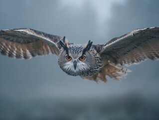 Powerful Eurasian Eagle-Owl in dramatic flight with wings spread wide against a misty natural habitat background
