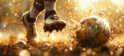 Soccer player kicking the ball with his foot, shoes closeup and action on the field football