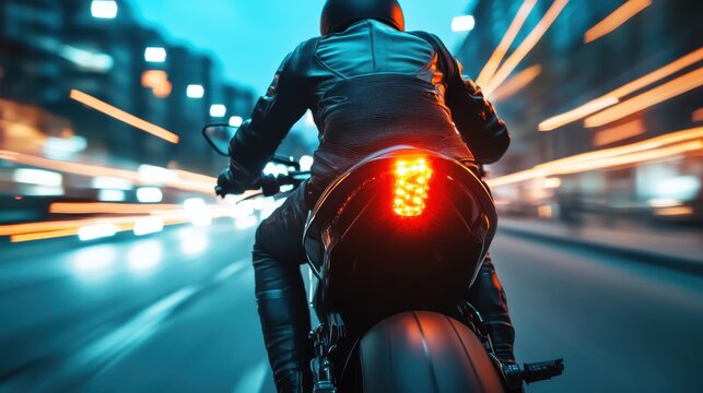 An exhilarating motorcycle ride through a bustling cityscape at night, captured in motion, highlighting the thrill of adventure and urban exploration under city lights.
