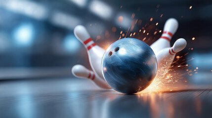 Bowling ball striking pins with sparks capturing dynamic action and impact.
