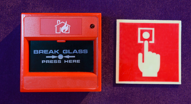 Close-up of the red manual Fire Call Point mounted or installed in the landing on a yellow wall. High-quality macro photography.
