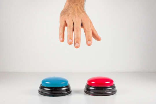 Press the Button: A single finger poised to press a bright red button against a vibrant blue backdrop. It symbolizes decision-making, action, and choice.