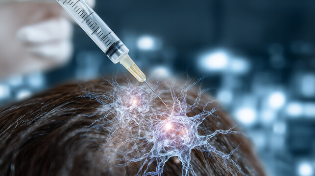 Plasma-rich platelet injections visualized being administered to scalp, microscopic view of activated growth factors stimulating dormant hair follicles, set in a bright clinical tr