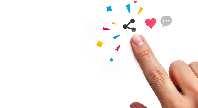 A finger taps on a screen, activating social media icons like share, like, and comment, surrounded by colorful confetti, symbolizing digital interaction and engagement