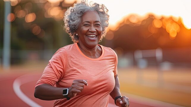 Smiling elderly black woman jogging at the sports stadium outside, promoting an active lifestyle and engagement in sports for senior people, AI generated