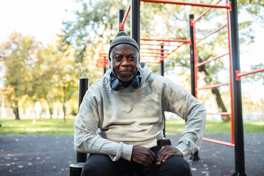 Fitness, gym and portrait of old man relax with water bottle for training, exercise and workout. Sports, retirement and person listening to music, audio and podcast for wellness, health and resting