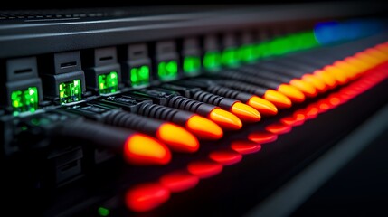 A close-up of illuminated audio equipment showcasing colorful lights, likely indicating active connections and levels.