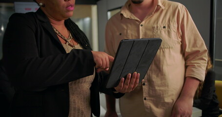 Colleagues analyzing stock market data in modern office setting