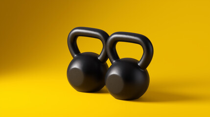 Two black kettlebells standing on vibrant yellow background with hard shadows.