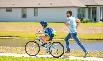 father and son enjoying a bicycle ride together. active son and father duo cycling on bicycle. father teaching his son to ride a bicycle. Bicycle bonding. father and son outdoor