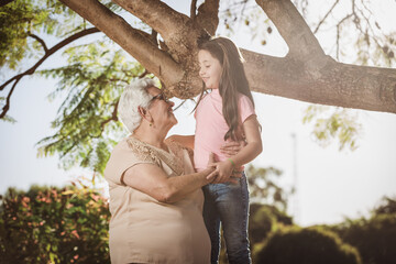 Grandmother playing with her granddaughter outdoors.