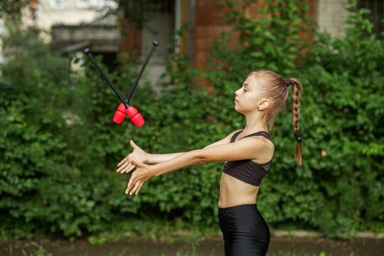 Rhythmic gymnastics. Preteen child exercising with gymnastic mace outdoor. Healthcare concept