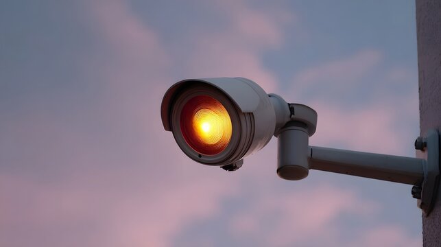 A security with a glowing orange is mounted on a wall against a colorful twilight sky with clouds