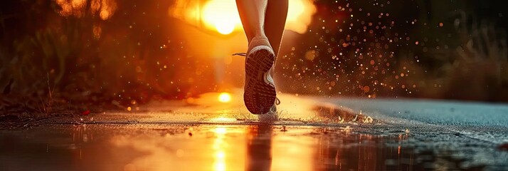 Dynamic close up of female runner feet in action on road at sunrise capturing essence of wellness and athletic young jogger embodying fitness and healthy lifestyle trains in early morning light