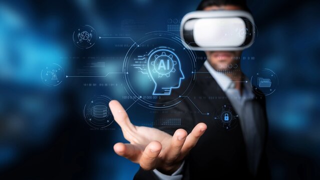 A businessman interacts with a virtual reality headset, showcasing artificial intelligence concepts in a futuristic setting that highlights digital transformation and innovation. Raster