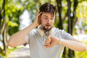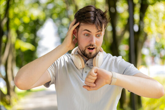 Sport Caucasian man looking smart watch at modern track runner using use smartwatch fitness bracelet Portrait fit male athlete checking result jogging in sportswear in street urban city park outdoor
