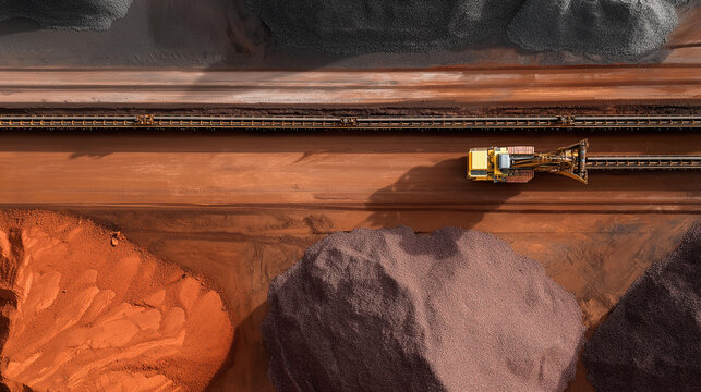 Heavy machinery and conveyor systems are visible at a mineral extraction site, surrounded by dust and vibrant colors, indicating active mining and processing of raw materials in progress.