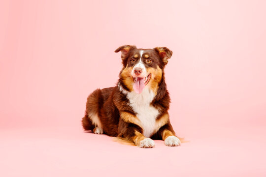 Australian Shepherd dog on a pink background - a captivating stock photo showcasing the vibrant personality and striking appearance of this energetic and intelligent breed.