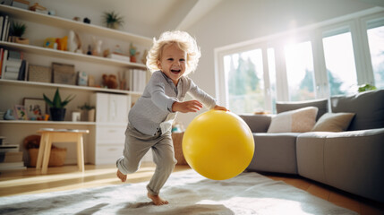 Little kid smiling while playing in his room in the house. Created with Generative AI technology.