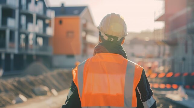 Construction worker in orange vest observes progress of high-rise buildings at dawn during active site operations in the city