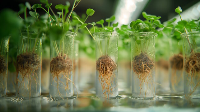 Plants with roots in test tubes, showcasing plant milking in aeroponic systems to extract active ingredients for sustainable farming and biotechnology