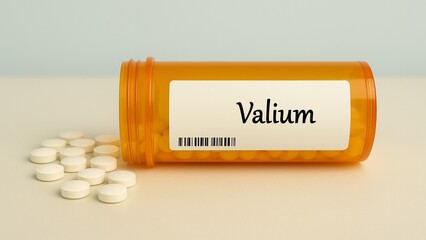 Box of Valium tranquilizer tablets placed on a clinical pharmacy table