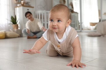 Happy mother watching her cute baby crawl on floor at home
