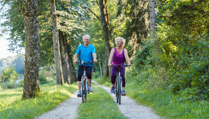 Full length of a happy and active senior couple wearing cool fitness outfits while riding bicycles outdoors in the park