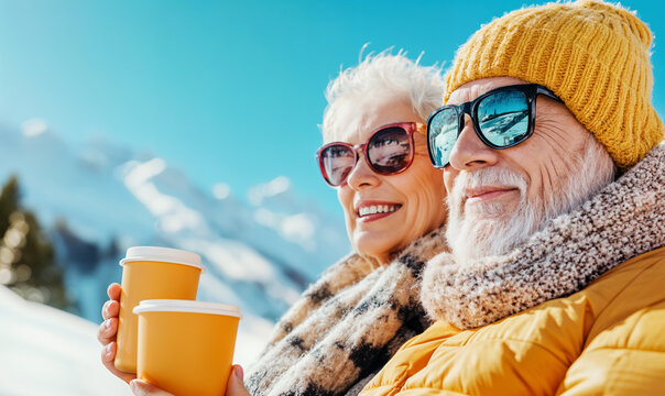 senior couple drinking hot beverages in snow mountains, generative ai