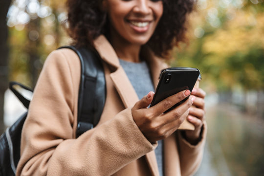 Beautiful young african woman wearing coat walking outdoors