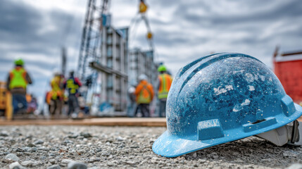 Blue hard hat at construction site during busy workday with diverse workers in background