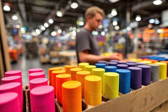 Workers organize colorful rolls of paper in a busy warehouse setting during daylight hours