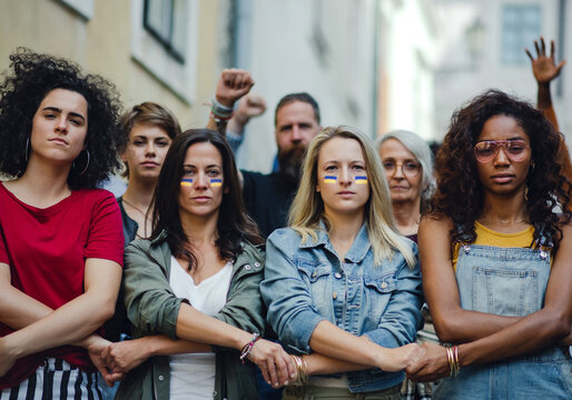 Crowd of activists protesting against Russian military invasion in Ukraine walking in street.