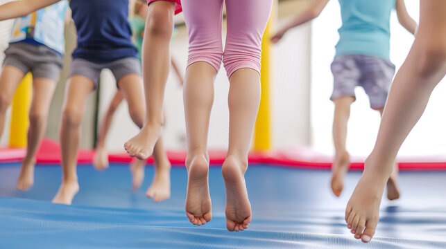 Gymnastics practice unfolds as children joyfully take turns jumping on a trampoline under watchful guidance.
