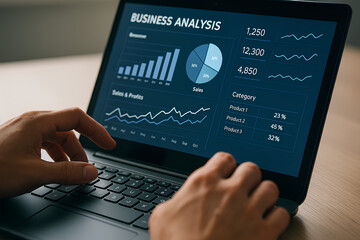 Business analysis dashboard on a laptop, with detailed sales and profit data visualizations