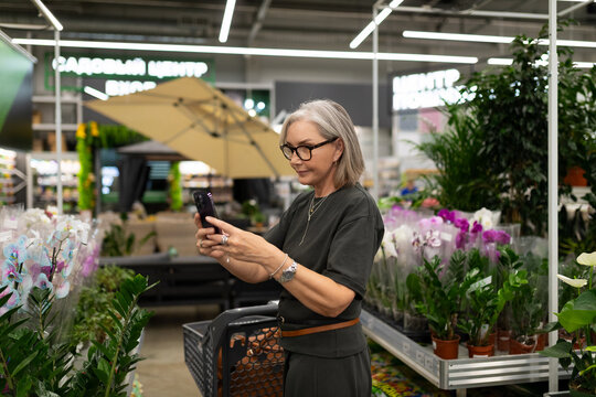Woman shopping for plants while using a smartphone in a garden center during day time